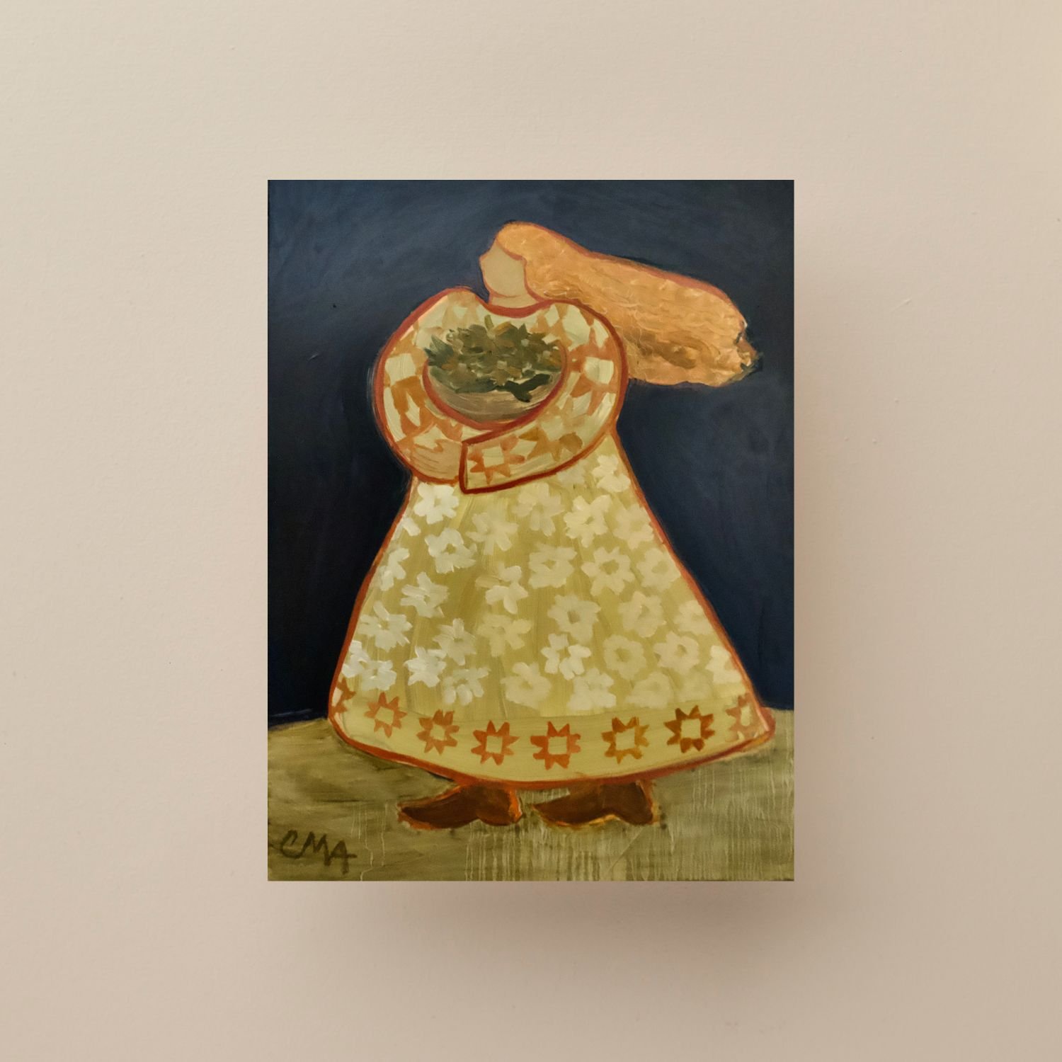 Original painting of a women in a sunshine dress holding a bouquet perfect for the harvest season.