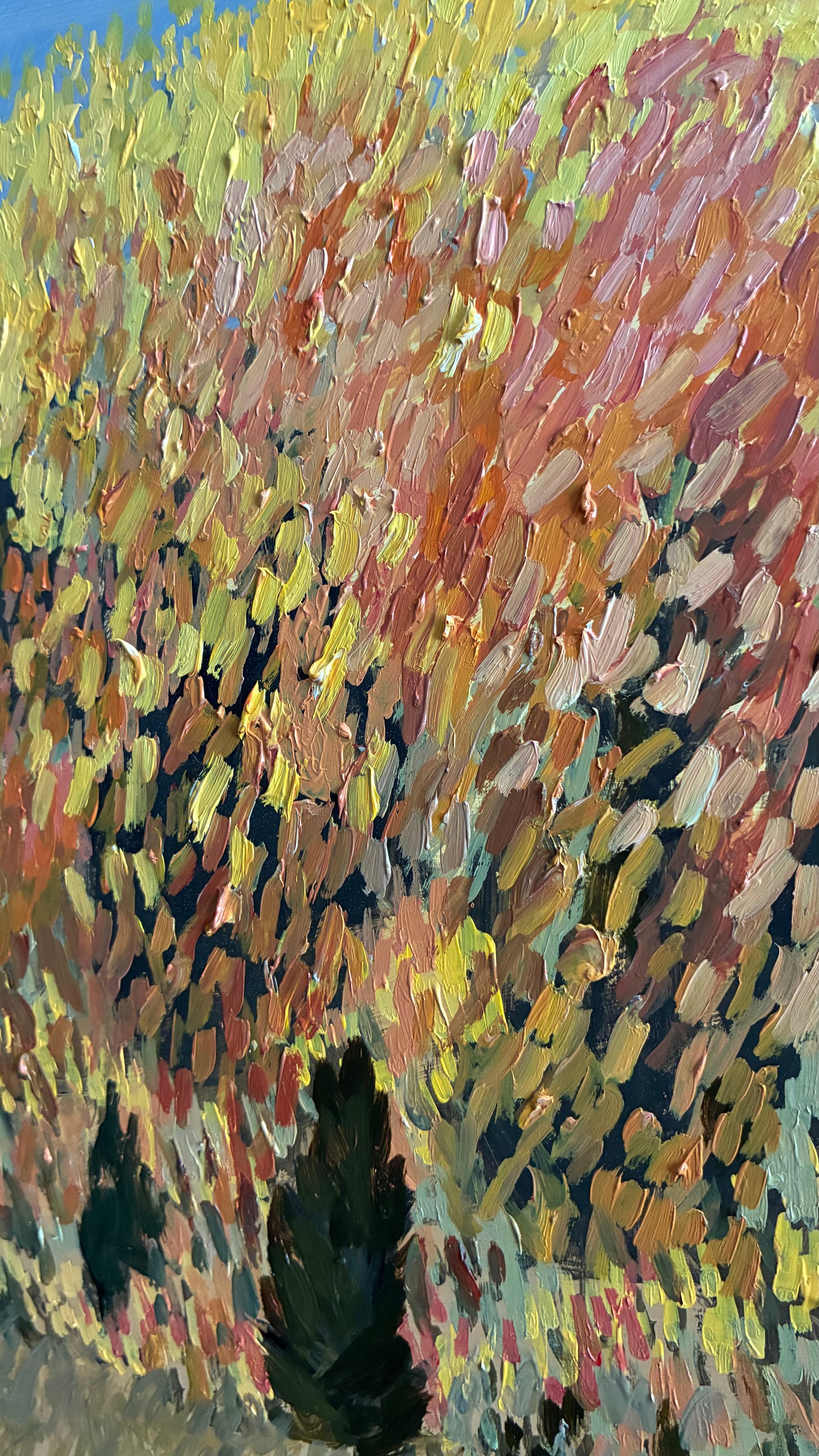 Original painting of giving stream winding around a meadow near blazing autumn Hillside. Painted outside after spending the weekend playing in the stream and at complete awe of the beauty of the mountain aspen colors.