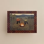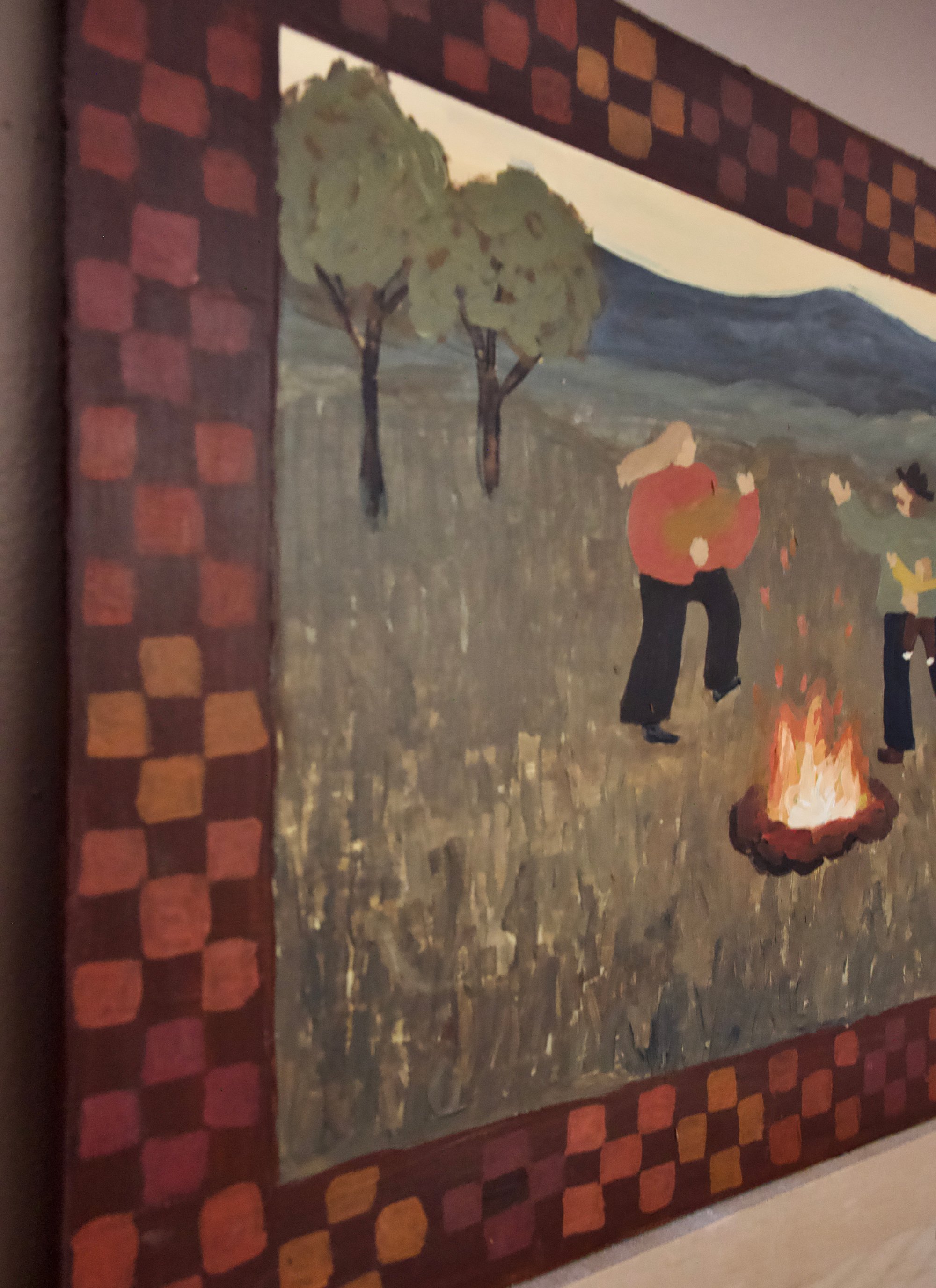 Original painting of a family singing and dancing around a fire. Celebrating their first year of being a family. Rust brown quilted checker border giving it a unique and folk inspired design.