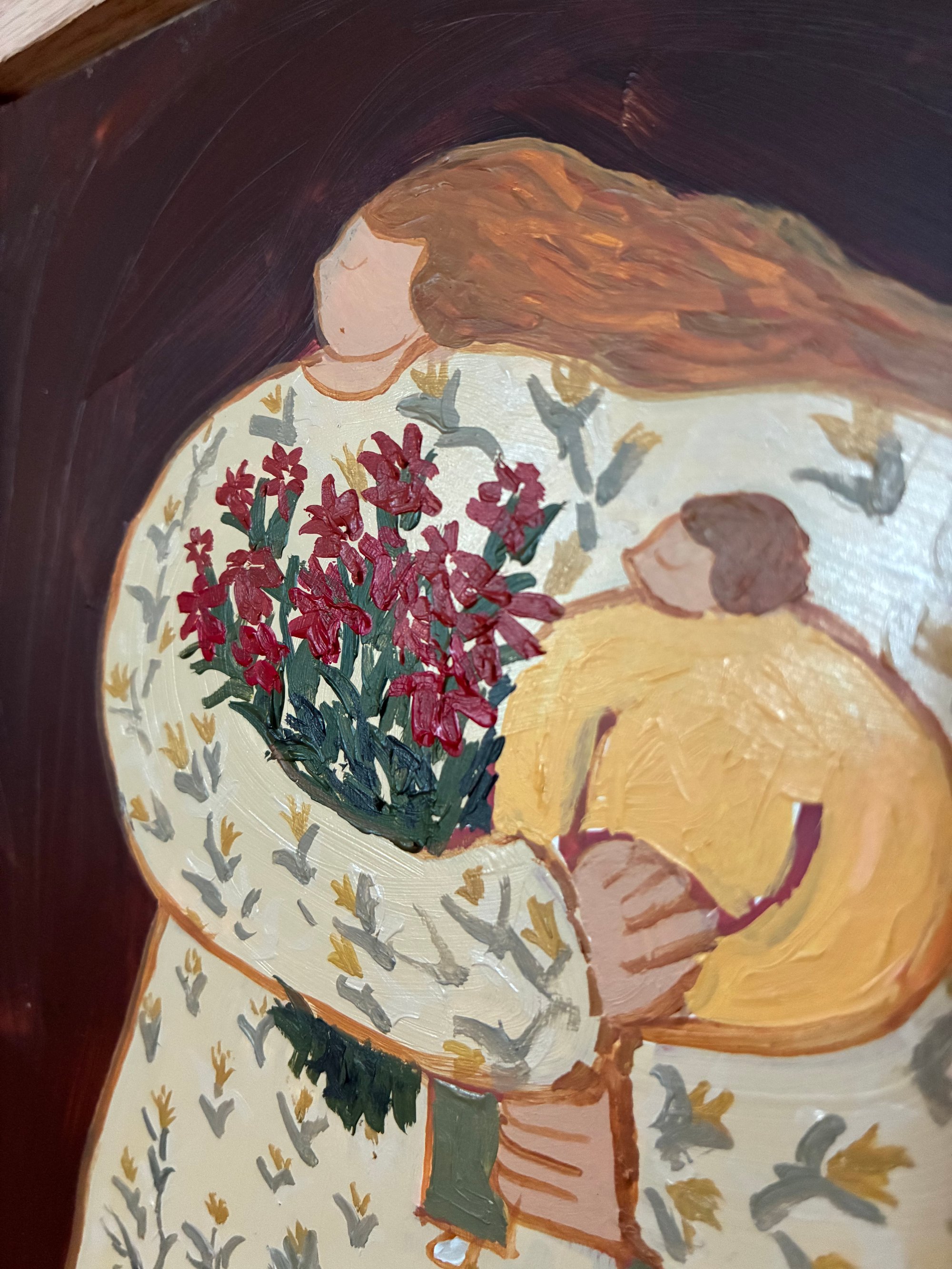 Original painting of a mama, baby, and flowers. She tends to her home and family in full beauty and grace.